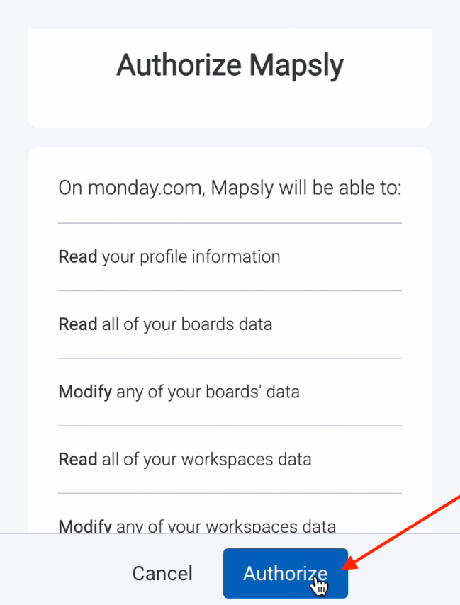 At Step 4 'Access to data' authorize Mapsly to get your data from monday CRM: