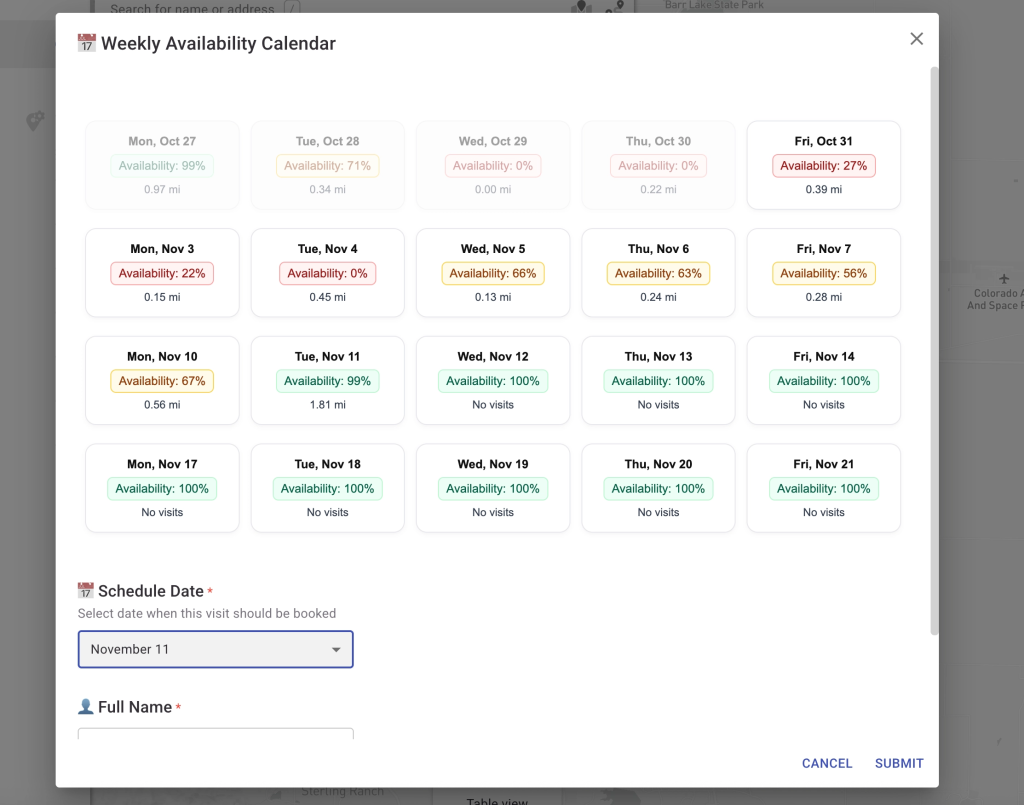 Frictionless booking: Enter a new meeting address → see the team’s calendars ranked by travel fit → select the best day → auto-create the meeting back to the connected CRM calendar.