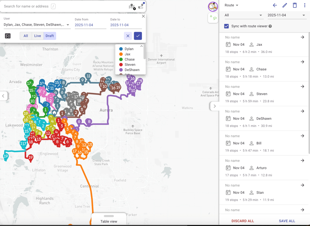 Coordinators can compare proximity across users, group appointments into compact clusters, and push balanced days that cut drive time while keeping service commitments intact.