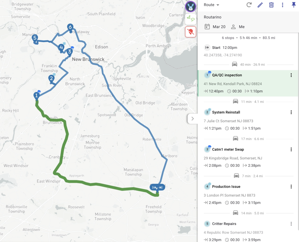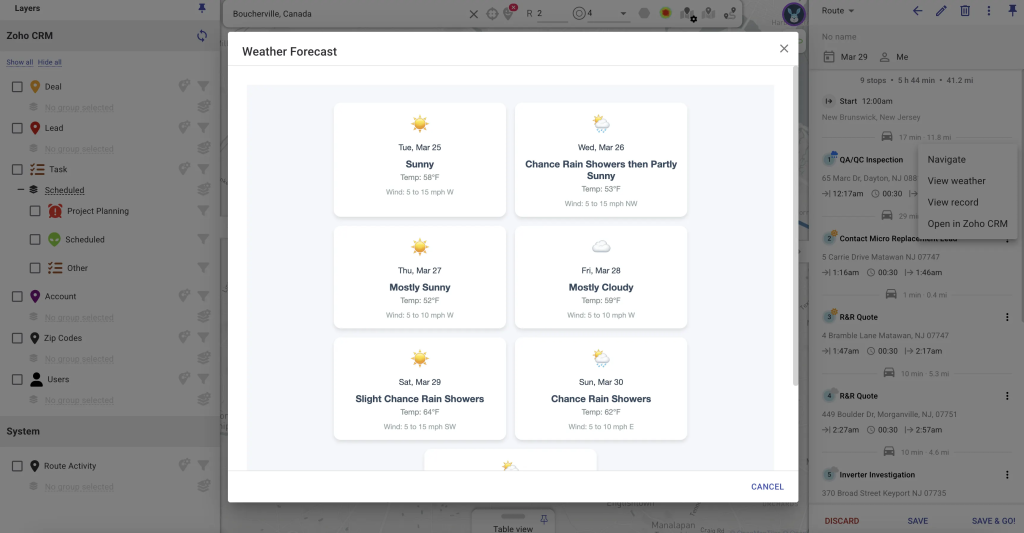Inline weather per stop: Each route activity can show a concise cue—e.g., a “🌧️” icon indicating rainy conditions—right in the Route panel. Crews see go/no-go at a glance.