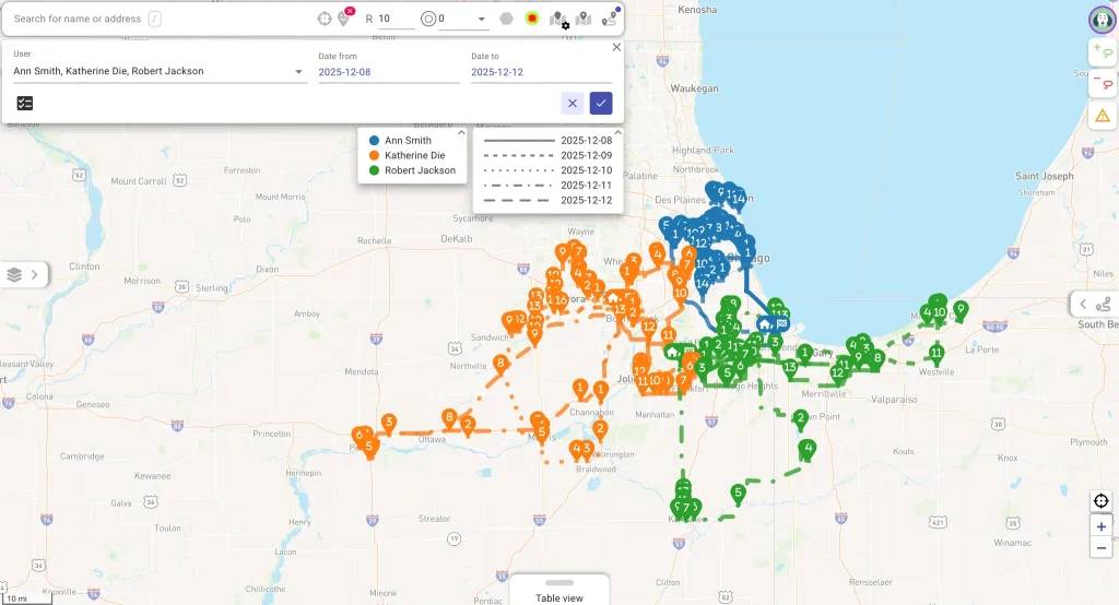 - Plan multi-day, multi-user routes with visit frequencies honored by Mapsly’s Planer für regelmäßige Besuche—over a full month, across 30+ users and 2,000+ locations.
