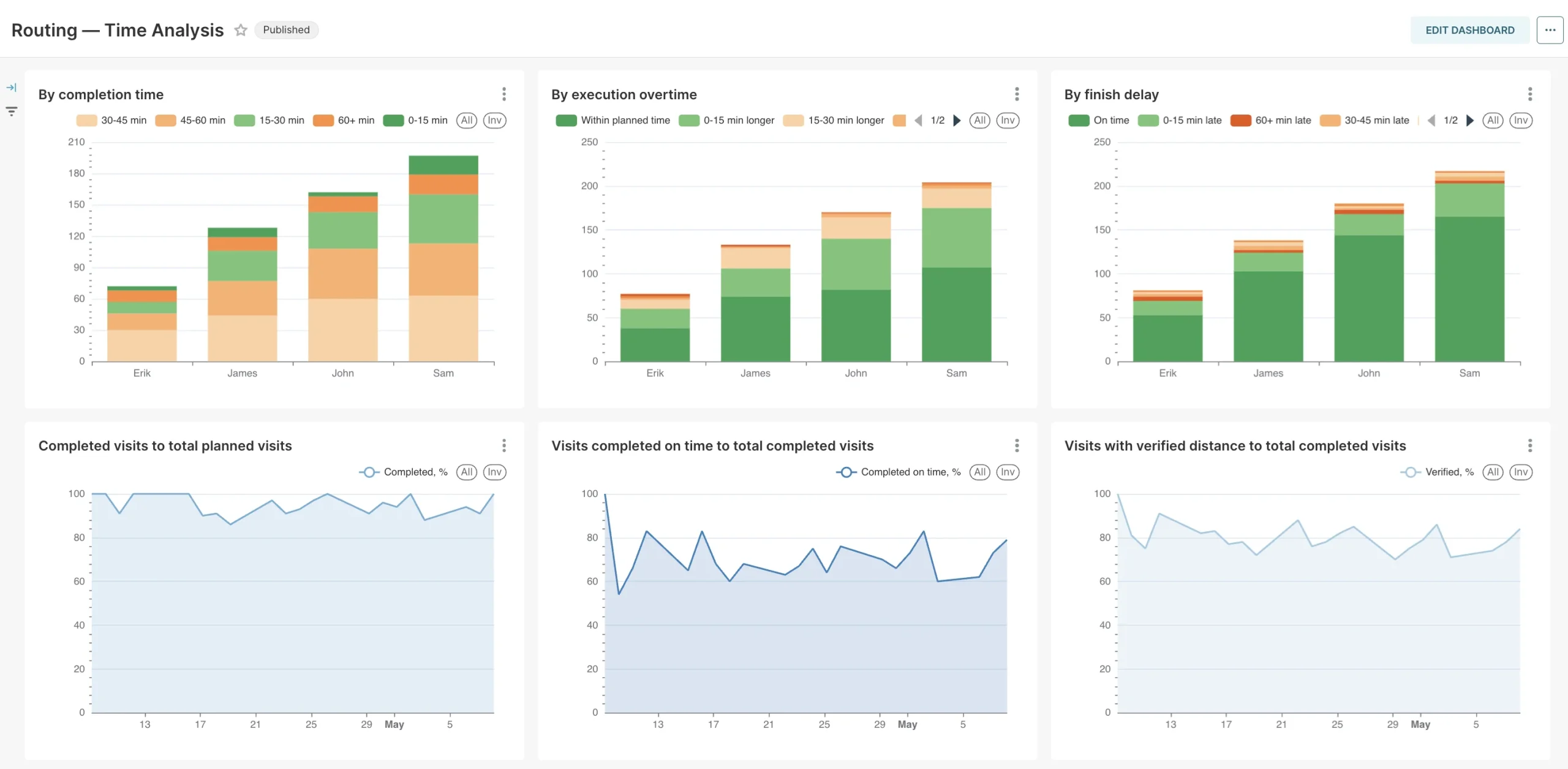 Gunakan dasbor aktivitas lapangan Mapsly untuk mengamati dan menganalisis metrik kinerja kritis tim Anda, seperti keterlambatan kedatangan dan keberangkatan, kunjungan yang terlewat, dan lembur pekerjaan — dirinci berdasarkan petugas lapangan atau digabungkan untuk subtim dan selama periode waktu tertentu. Pelajari lebih lanjut
