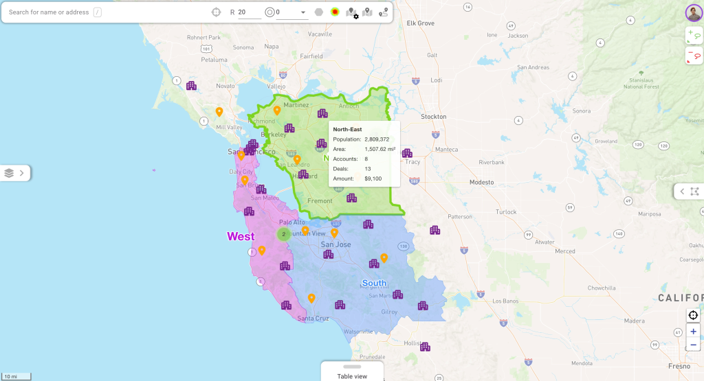 Spatial filtering of CRM records: Instantly find CRM records that fall inside selected zones, then build geo-targeted lists or routes from that selection.