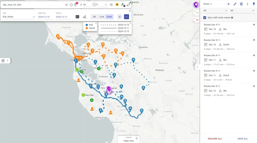 Plan efficient routes days, weeks, or even months ahead — across up to 2,000 locations and 30 users at once. Mapsly factors in schedules, open hours, required skills, equipment, and more, while letting you choose custom optimization goals.