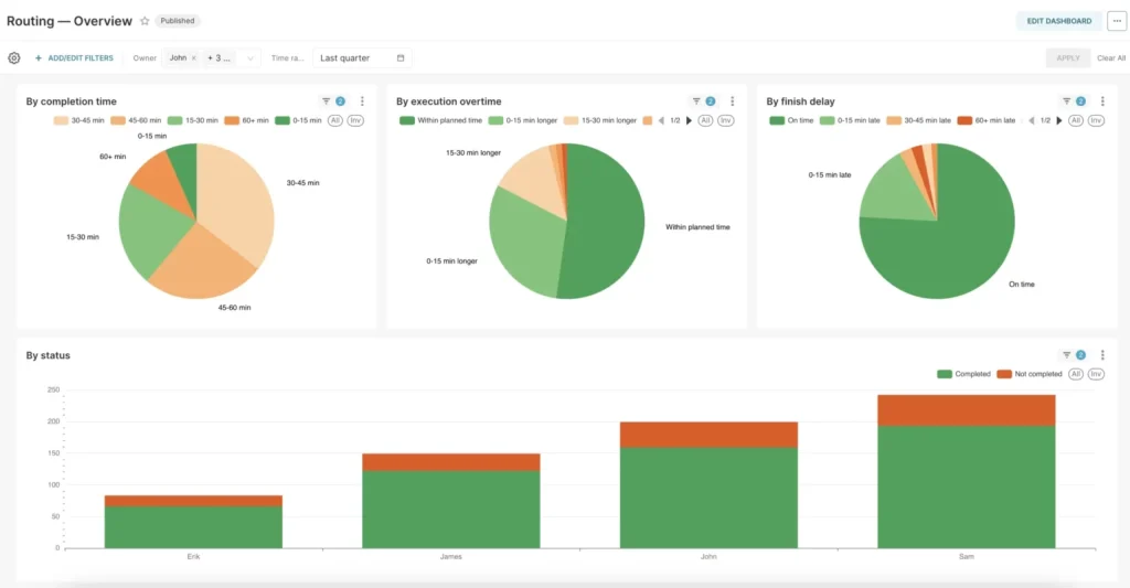 Analyze field performance with dashboards powered by Mapsly Analytics. Out of the box, you’ll see key metrics and time analysis — all fully customizable and synced with your CRM data.