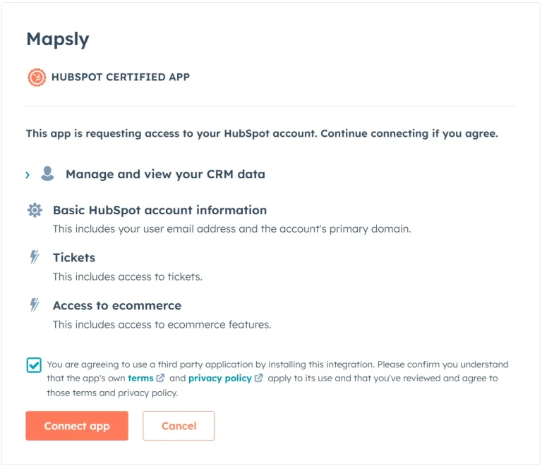 Mapsly exchanges data with your HubSpot through its API and allows SSO (Single Sign-On) so that your users log into Mapsly with their HubSpot credentials. To start the trial,you must be a HubSpot Administrator. If you are not HubSpot administrator, please refer to this help article first.